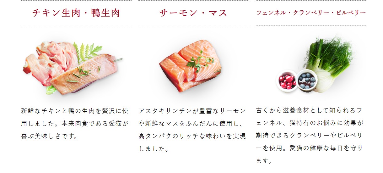 「主原料に新鮮なチキンや鴨の生肉を使用し、動物性タンパク質が非常に豊富な点は、肉食動物である猫の栄養学的に見て非常に理想的です。グレインフリーであることも、消化器への負担やアレルギーのリスクを低減する上で評価できます。クランベリーやビルベリーといった抗酸化物質を含む食材の配合も、健康維持の観点から良い試みだと感じます。価格は高めですが、その価値は十分にあるフードの一つと言えるでしょう。」